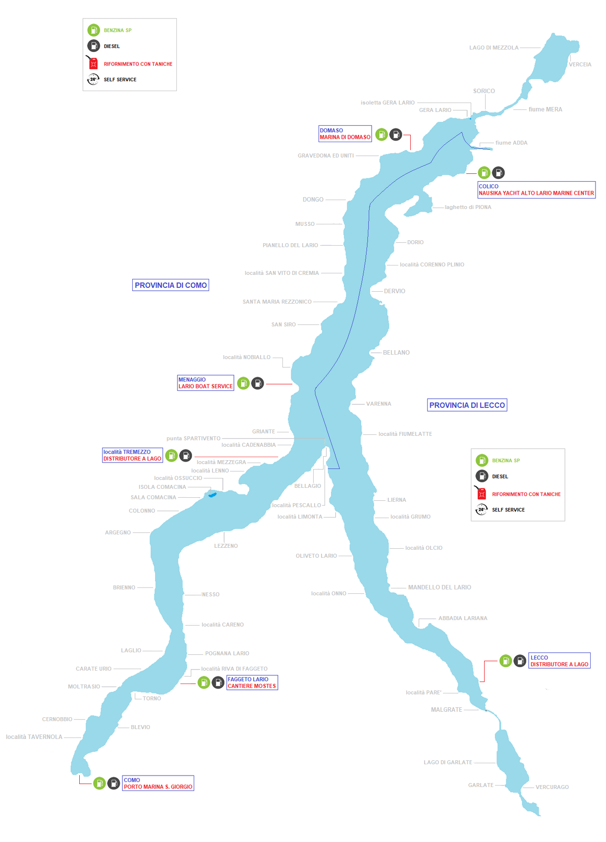 cliccate nella mappa sul nome delle stazioni di rifornimento per ottenere le informazioni desiderate, questa cartina comprende solo i benzinai con rifornimento direttamente a lago