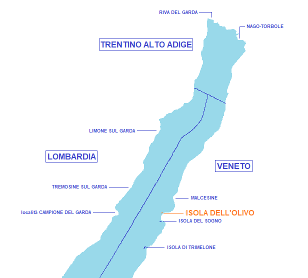 L'isola dell'Olivo si trova a 200 metri dalla costa di Malcesine, si estende per circa 98 metri di lunghezza e una larghezza approssimativa di 40 metri, è composta uno sperone roccioso coperto da alcuni alberi e vegetazione e prende il nome per la presenza di piante di olivo sul suo terreno. E' sicuramente meta di sub, che possono esplorare a circa 13 metri di profondità una piccola grotta, ricca di piante e fauna lacustre, la cui parte finale si inabissa fino a 30 metri. A nord dell'isola si può vedere, appoggiato al fondale, un relitto di circa 10 metri, diventato rifugio di svariate specie di pesci. Data la sua posizione, questa isola è spesso utilizzata come punto di riferimento per molte gare veliche e regate importanti come la "Centomiglia". L'isola dell'Olivo, costituita da rocce lisce ed inclinate rivolte verso ovest, offre buone possibilità allo sbarco e alla sosta, potendo attraccare in parecchi punti.