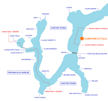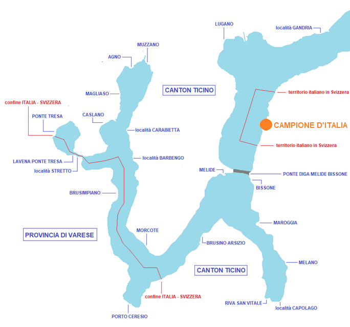 Campione d'Italia è un territorio italiano della provincia di Como, completamente circondato dalla Svizzera e più precisamente dal Canton Ticino, sulla sponda orientale del lago di Lugano, situata sulla strada tra Bissone e Claino con Osteno. L'origine della sua italianità risale ad una donazione di un signore longobardo, chiamato Totone, che fece alla basilica di Sant'Ambrogio nel 777. Quando la Svizzera nel 1512 ottenne il Ticino, inglobando anche Campione, l'abate di Sant'Ambrogio riuscì a mantenere l'autonomia: più volte nel corso dei secoli gli elvetici tentarono di rivendicarne il possesso senza mai riuscirci. Tra le particolarità, nella cittadina le automobili hanno targa ticinese, i salari sono pagati in franchi svizzeri, l'iva è elvetica, le forze dell'ordine così come i francobolli sono italiani. Famosa per il suo Casinò, ha riaperto il 26 gennaio 2022 dopo tre anni d'inattività a seguito della dichiarazione di fallimento del 27 luglio 2018 dal Tribunale di Como, revocato dalla Corte di Cassazione nel dicembre 2020. Da vedere la chiesa di San Zenone, ricostruita nel XIV secolo e sconsacrata dal 1967, attualmente adibita a galleria per l'esposizione di mostre artistiche; la nuova chiesa parrocchiale di San Zenone, un monumentale edificio moderno; la chiesa oratorio di San Pietro e la chiesa di Santa Maria dei Ghirli, meta di pellegrinaggio, su un terrazzo direttamente raggiungibile dal lago mediante una monumentale scalinata doppia di quattro rampe.