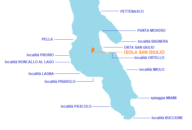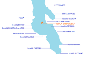 L'isola San Giulio è situata di fronte all'omonima località di Orta San Giulio in un contesto incantato, a circa 400 metri dalla sponda di quest'ultima. L'isola è fortemente caratterizzata dalla presenza del Palazzo dei Vescovi dell'800, attualmente sede di un convento di clausura femminile, meglio conosciuto come l'Abbazia benedettina "Mater Ecclesiae": qui viene prodotto il "pane di San Giulio". Il quadro fiabesco viene completato dalla presenza dell'altrettanta famosa basilica di San Giulio, dove riposano le spoglie del Santo. L'isola è attraversata da uno stretto sentiero in ciotolato che rende ancora più misteriosa ed affascinante un'eventuale escursione.