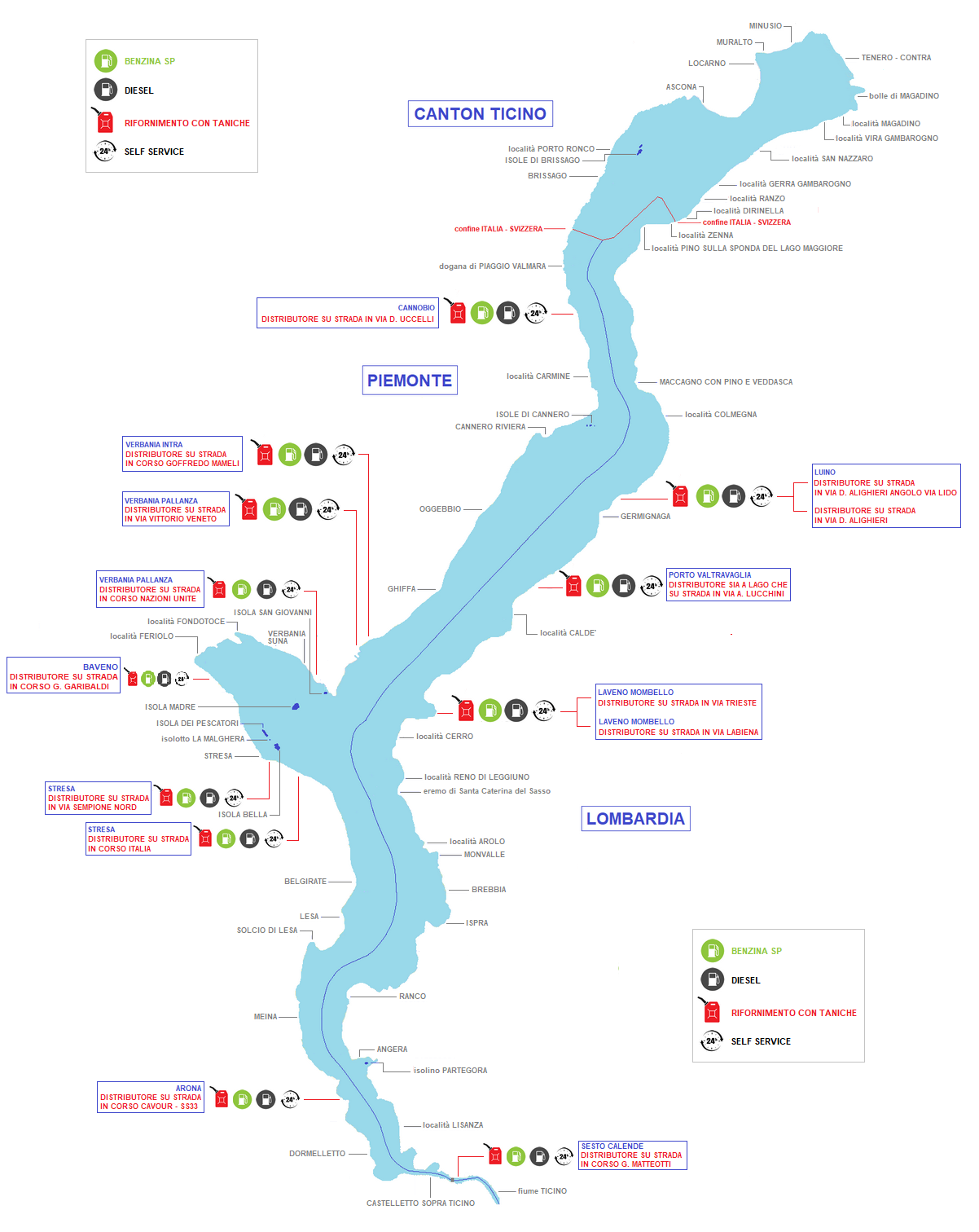 RIFORNIMENTO : con taniche, presso il distributore su strada, è possibile ormeggiare temporaneamente presso i porti di Laveno Mombello (distanza a piedi: a 200 mt. circa dal porto comunale e a 610 mt. circa dalla Marina Portolabieno) o al pontile galleggiante di Laveno Mombello (distanza a piedi: a 340 mt. circa)