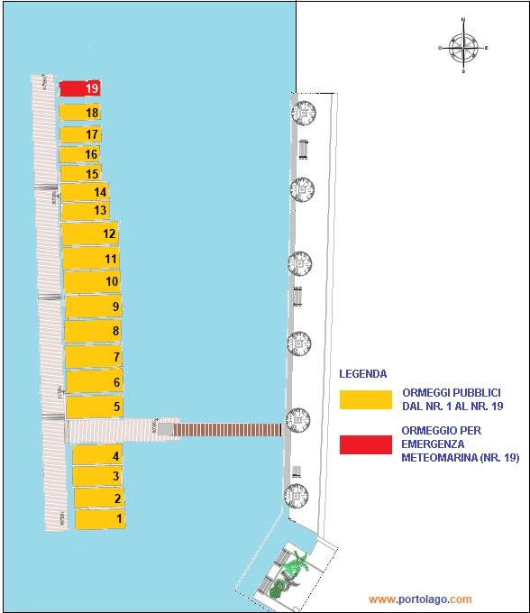 Sul lungolago Vittorio Girardi, è posizionato un comodo pontile galleggiante, fornito di attracchi per l'ormeggio temporaneo. Di notte, è segnalato da un fanale bianco.